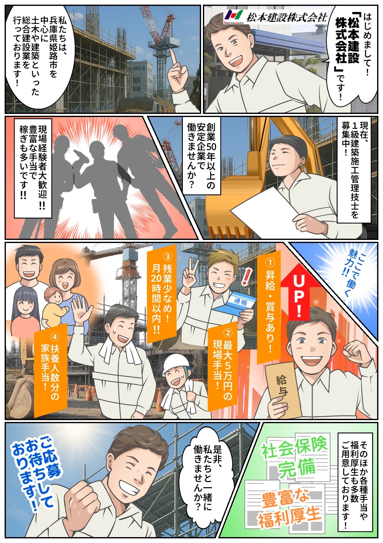 松本建設株式会社は、公共工事から民間工事まで幅広い建築工事を手がける地域密着型の建設会社です。姫路市を中心に安定的に案件をいただいており、今後の事業拡大を見据えて「1級建築・土木施工管理技士」を募集いたします。